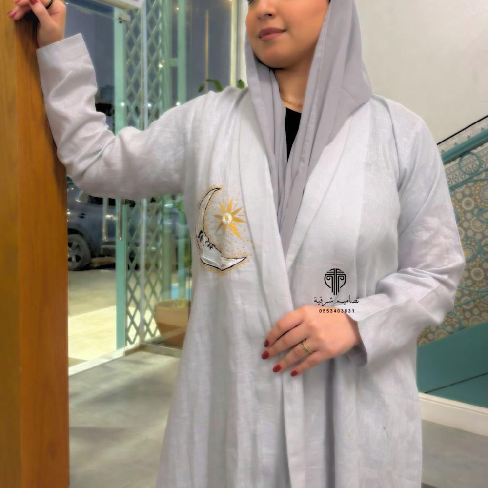 تألقي بإطلالة ناعمة وفاخرة مع عباية رمادي من لنن هندي طبيعي من متجر تصاميم شرقية، بتصميم أنيق يناسب ذوق المرأة السعودية العصرية.